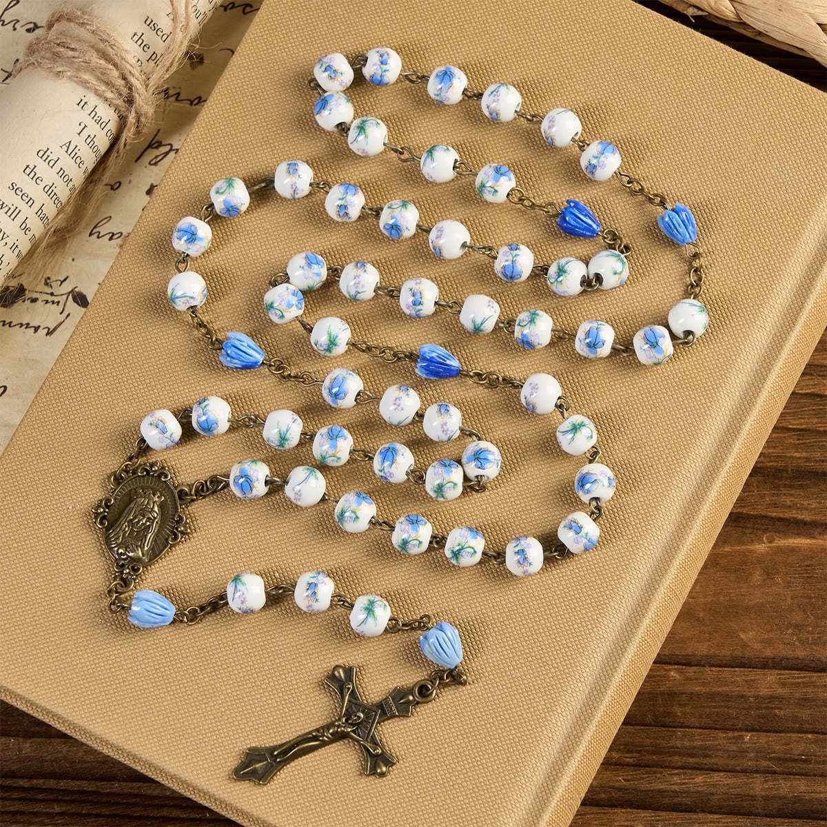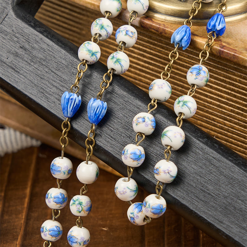 Our rosary features delicate blue floral ceramic beads, symbolizing purity and inner peace. The intricate floral designs and unique textures of the beads add a serene and enriching dimension to your prayers. The smooth and cool texture of the ceramic beads feels comforting in your hands, enhancing your prayer experience with their elegant presence. - Immaculate Heart of Mary & Crucifix